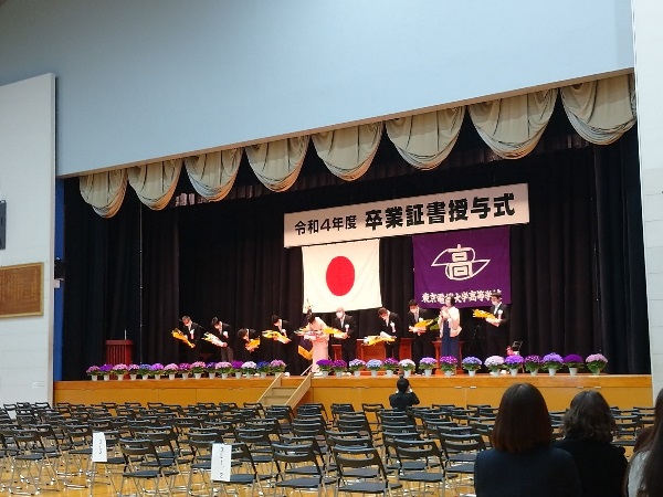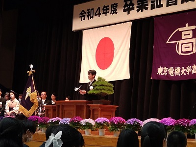 校長先生の式辞に続いて、来賓の学校法人東京電機大学理事長の祝辞と、簡略化した式次第で粛々と執り行われました。