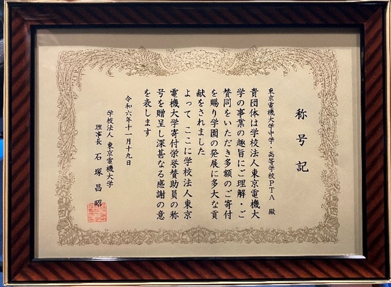 最後に、本校PTAが長年にわたり寄付を通じて学術振興への支援を行ってきたことをご評価いただき、東京電機大学より栄誉賛助員の称号および賞状を拝受いたしました。今回の受賞を励みに、今後も一層の貢献できるよう努めてまいります。