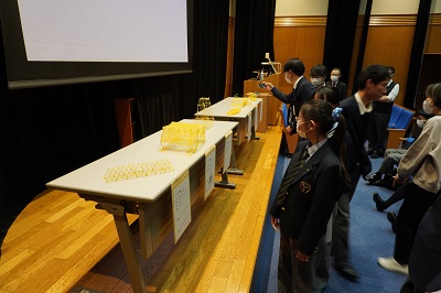 このイベントは、中・高・大連携によるものづくりイベントで、パスタをホットボンドで接着して橋の模型をつくり、その美しさや強度を競うというものです。中1~高2の希望者22名が参加しました。