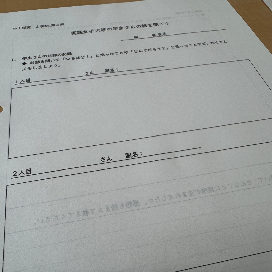 本校では、実践女子大学との高大連携の一環として、中学1年生の探究の授業に実践女子大学の学生3名をお招きしました。
