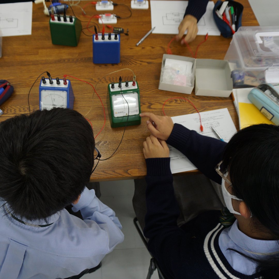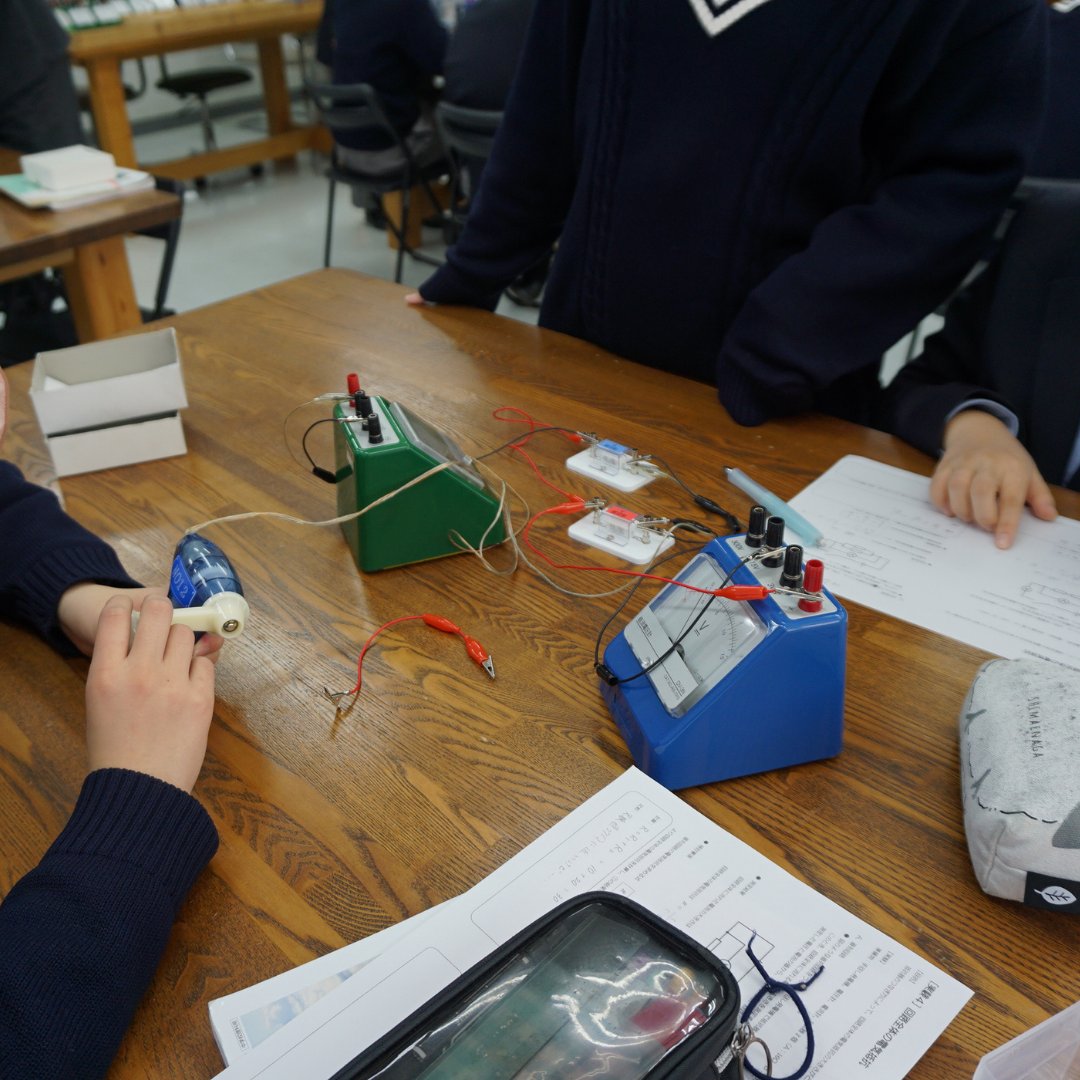 生徒たちは、抵抗器の抵抗値を変化させると電流がどのように変化するのかを観察し、抵抗が大きいほど電流が小さくなるという関係を確認しました。