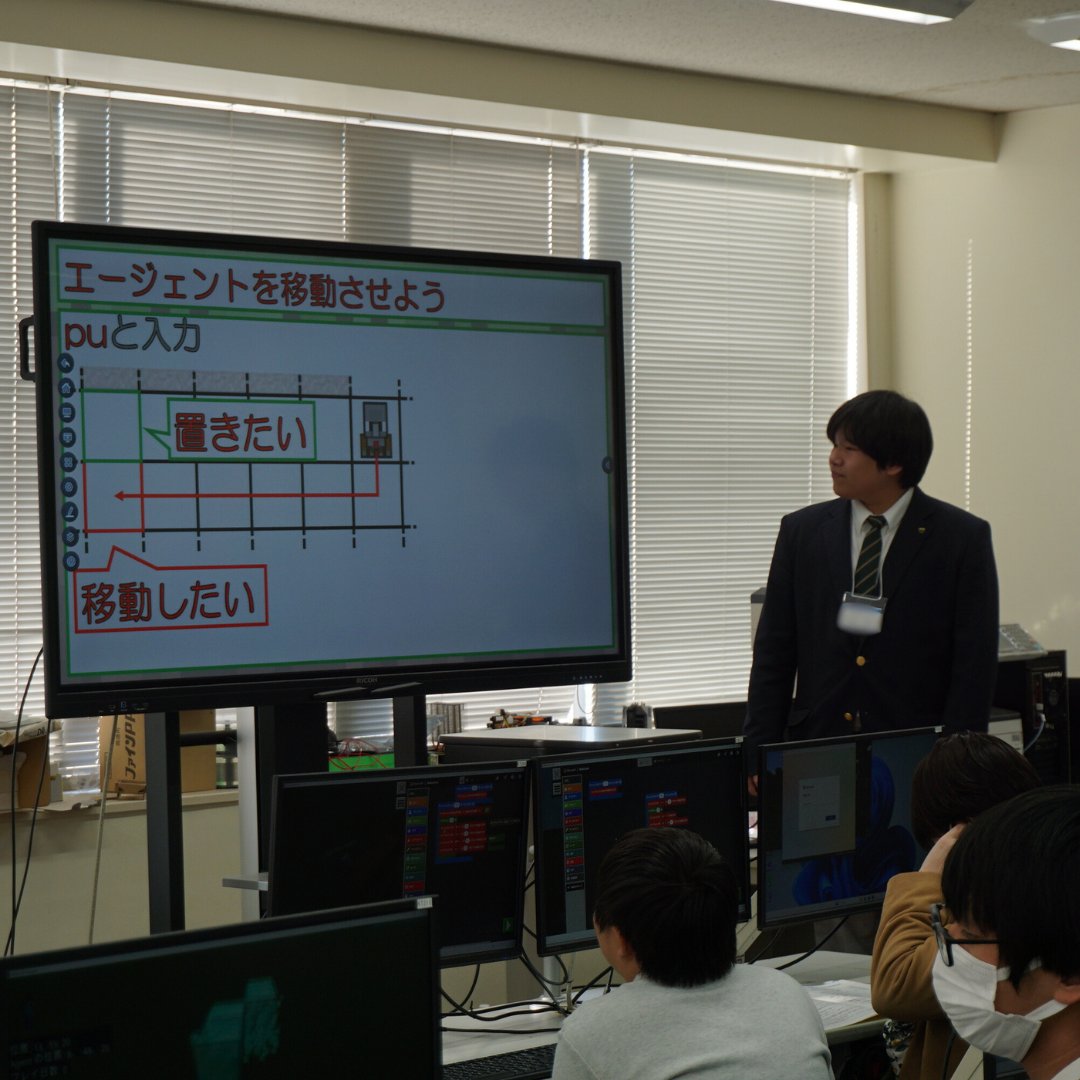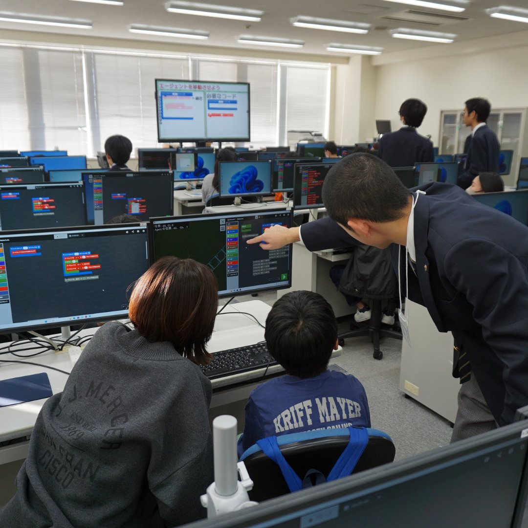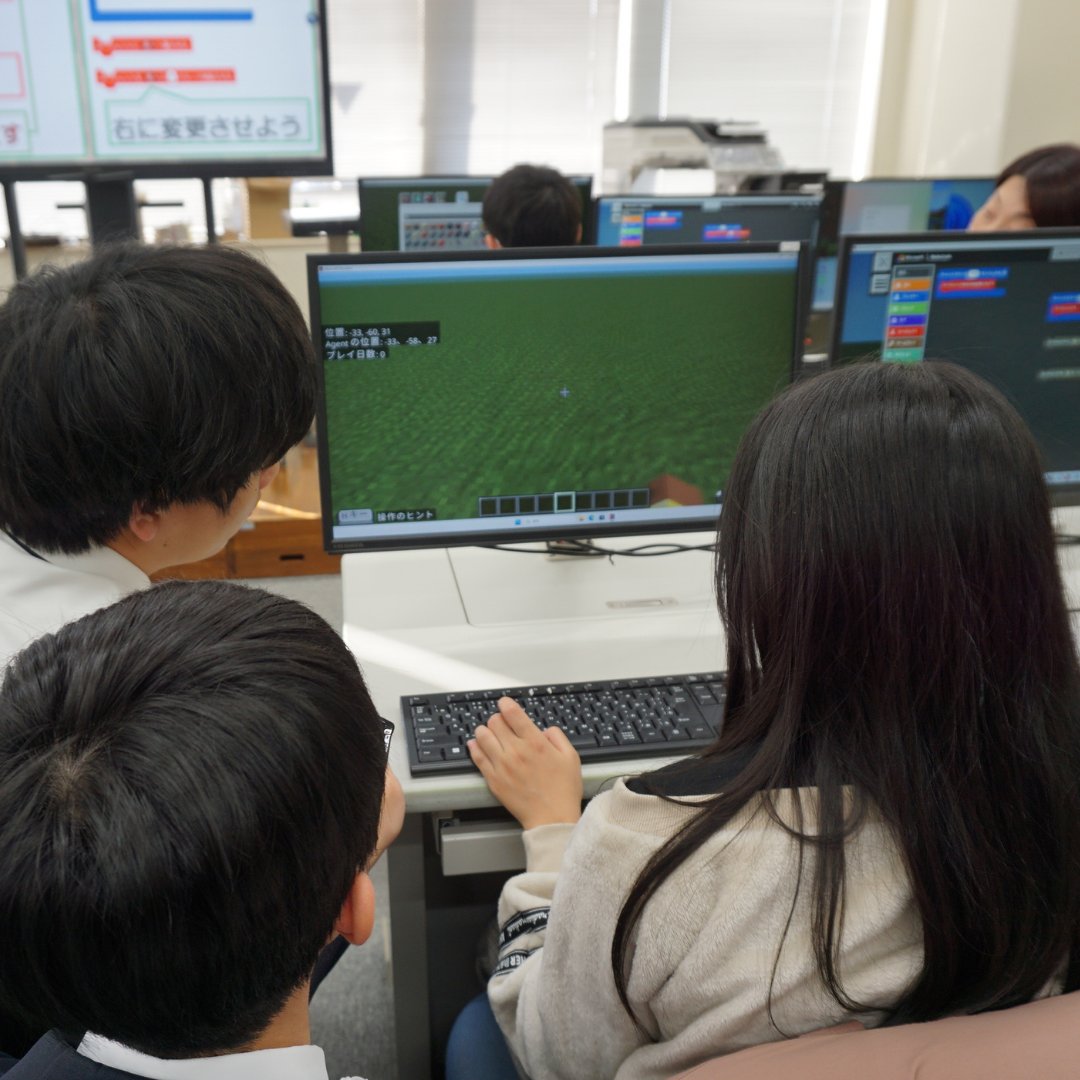 当日はコンピュータ部の在校生が指導役となり、本校の中学生の授業でも使用している教育用マインクラフトを使って体験していただきました。