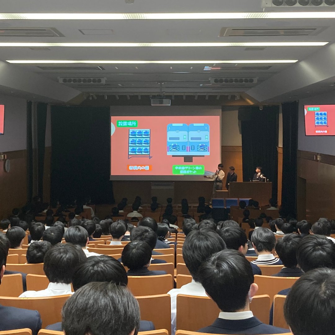 続いて、各クラスの代表班が小ホールに集まり、全体発表を実施しました。