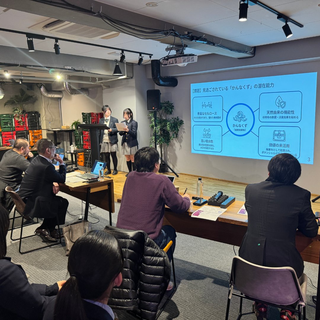 年間約60トンにもおよぶ良質な秋田杉が低価格な資材として県外へ運ばれている現状を「もったいない」と捉え、この産業廃棄物を高付加価値な天然吸水ポリマーへと変換し、秋田発の次世代紙おむつとして活用するビジネスプランを提案しました。