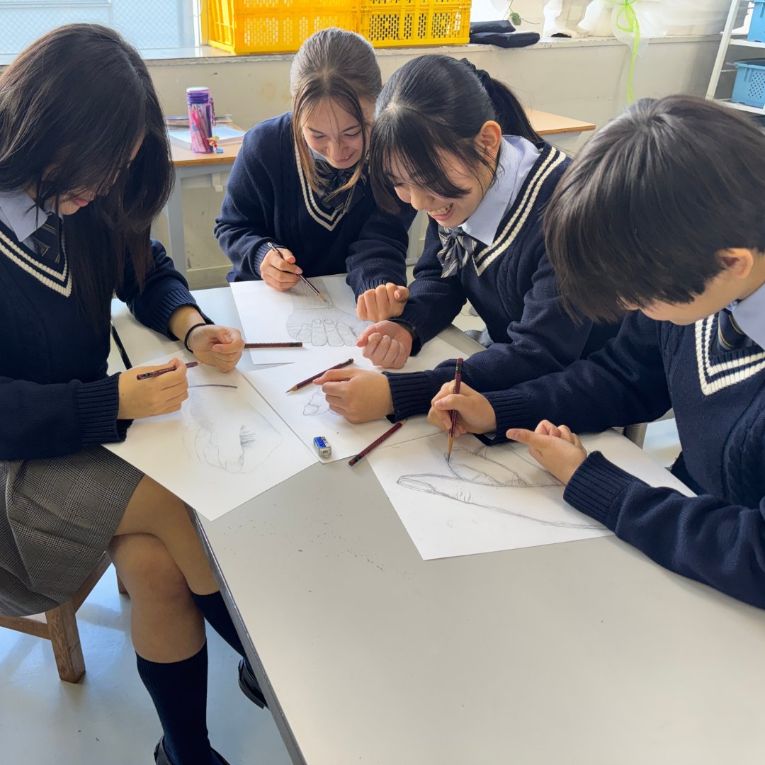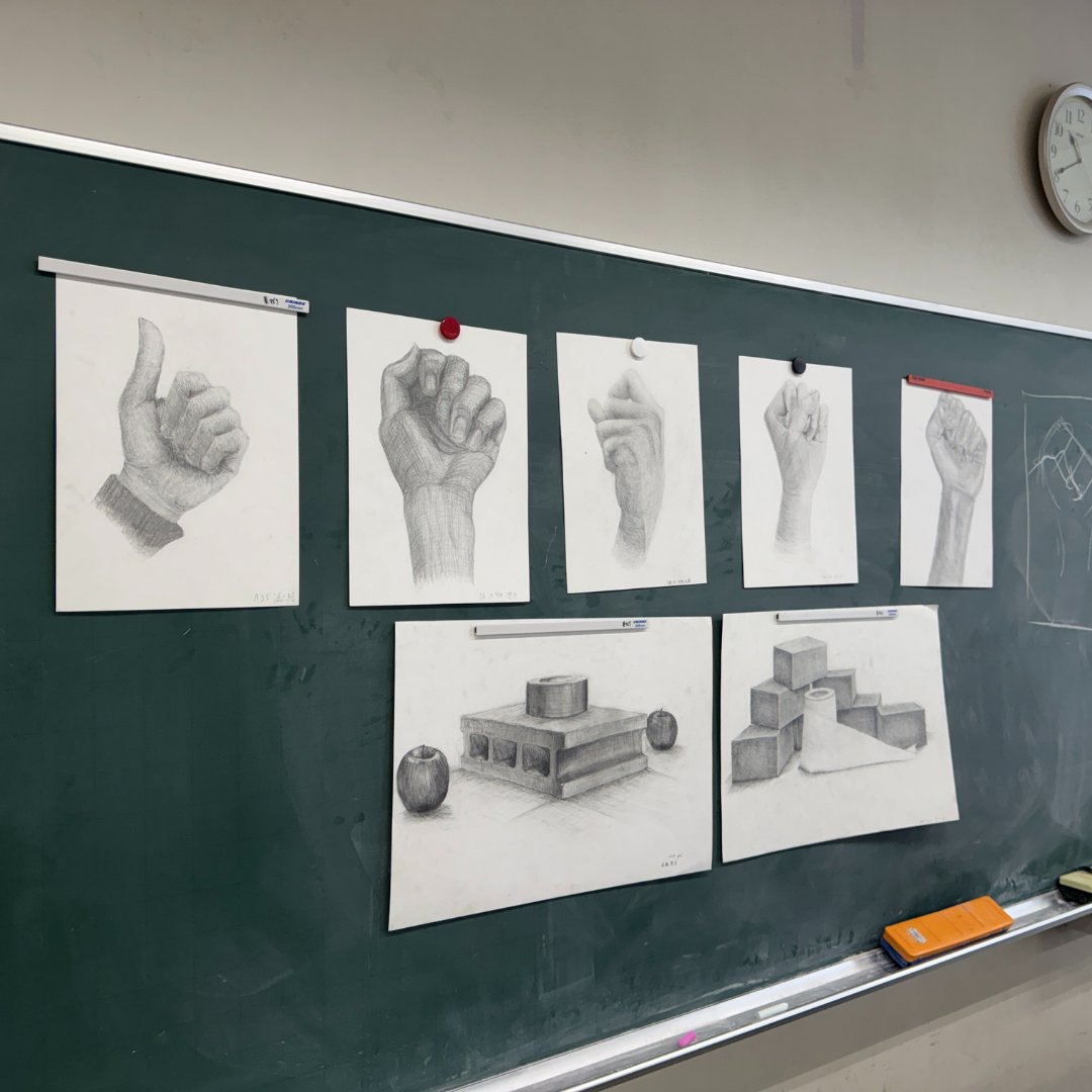 生徒たちは自分の手をじっと見つめ、指の曲がり方や関節の凹凸、骨ばった部分など、細かな形を丁寧に観察しながら鉛筆を走らせていました。