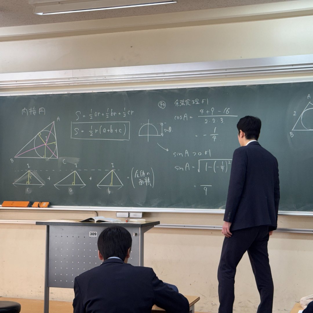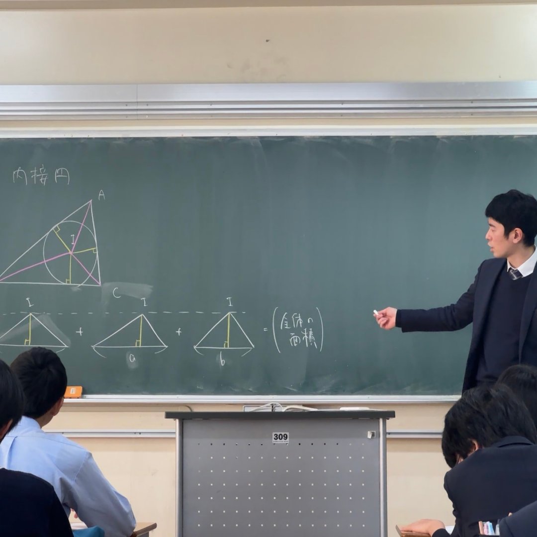 この日の授業では、三角形の3辺と内接円の半径の関係に着目し、面積とのつながりを図を用いて丁寧に確認していきました。