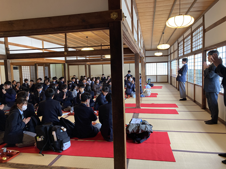 薬師寺ではご住職のユーモアを交えたお話を拝聴し、生徒たちも熱心に耳を傾けていました。