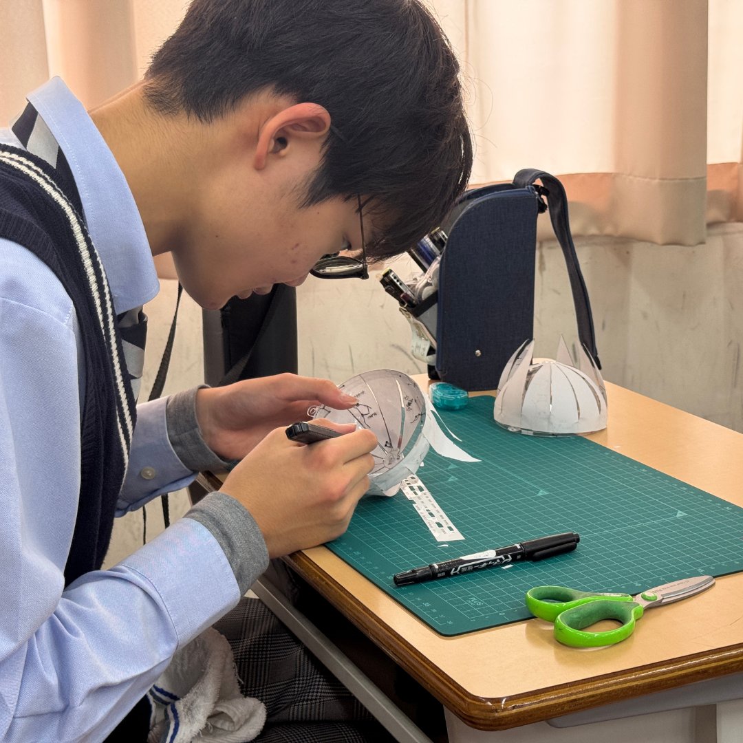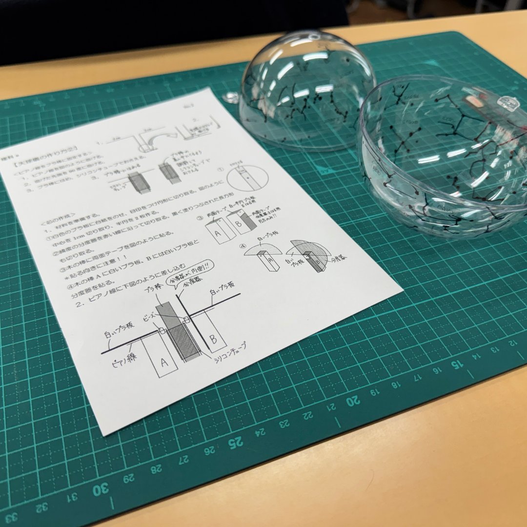 配布された手順書をもとに、まず透明ドームに星を写しとり、その後プラ板や分度器、目盛りシールなどを組み合わせ、星の動きを立体的に確かめられるモデルを自分たちの手で組み上げていきます。