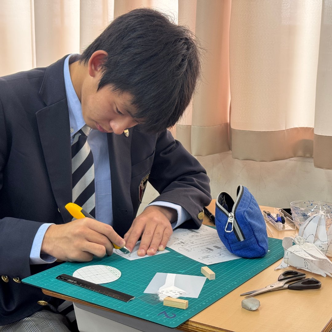 作業台にはカッターマットや定規、はさみが並び、手順書の図を何度も確認しながら慎重に進める姿が見られました。
